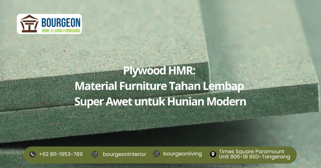 ArtikelBourgeon Home Living – Dalam dunia interior dan pembuatan furniture, pemilihan material yang tepat adalah kunci utama agar produk tidak hanya indah secara visual, tetapi juga kuat, awet, dan fungsional dalam jangka panjang. Salah satu material papan lapis modern yang semakin populer karena keunggulannya adalah Plywood HMR (High Moisture Resistant).